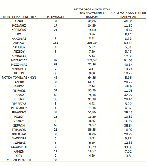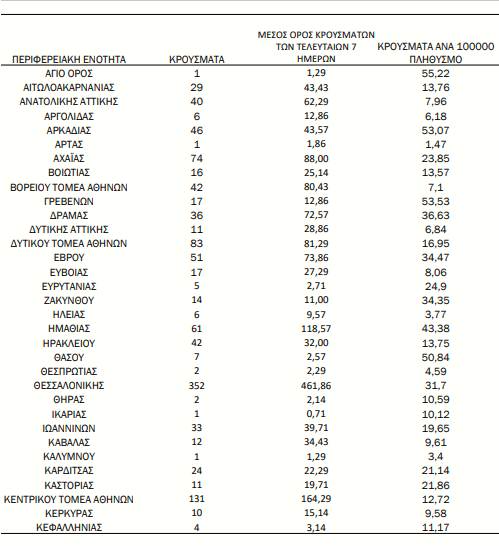 Τα νέα εργαστηριακά επιβεβαιωμένα κρούσματα της νόσου που καταγράφηκαν τις τελευταίες 24 ώρες είναι 2.098 , εκ των οποίων 10 εντοπίστηκαν κατόπιν ελέγχων στις πύλες εισόδου της χώρας. Ο συνολικός αριθμός των κρουσμάτων ανέρχεται σε 716.358 (ημερήσια μεταβολή +0.3%), εκ των οποίων 50.8% άνδρες. Με βάση τα επιβεβαιωμένα κρούσματα των τελευταίων 7 ημερών, 145