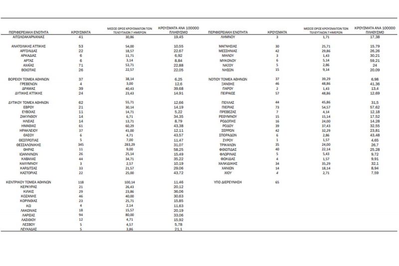 Τα νέα εργαστηριακά επιβεβαιωμένα κρούσματα της νόσου που καταγράφηκαν τις τελευταίες 24 ώρες είναι 2.125, εκ των οποίων 7 εντοπίστηκαν κατόπιν ελέγχων στις πύλες εισόδου της χώρας.