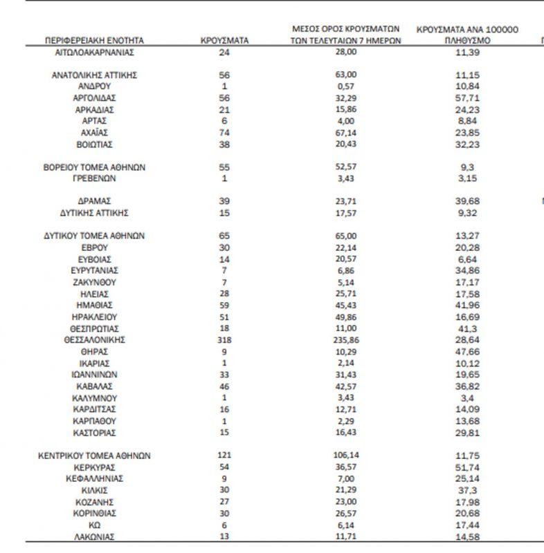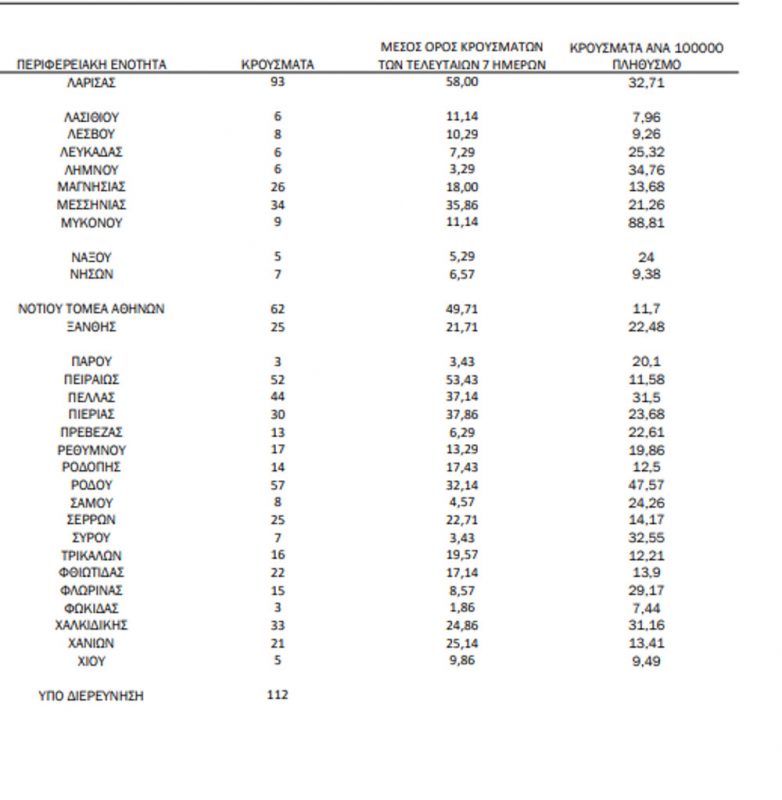 Με βάση τα επιβεβαιωμένα κρούσματα των τελευταίων 7 ημερών, 186 θεωρούνται σχετιζόμενα με ταξίδι από το εξωτερικό και 2.801 είναι σχετιζόμενα με ήδη γνωστό κρούσμα.