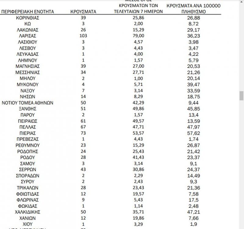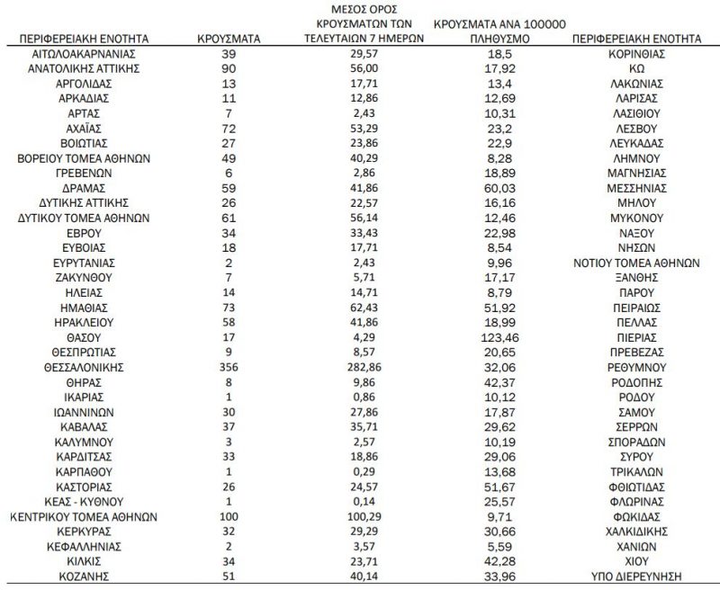 Τα νέα εργαστηριακά επιβεβαιωμένα κρούσματα της νόσου που καταγράφηκαν τις τελευταίες 24 ώρες είναι 2.329, εκ των οποίων 9 εντοπίστηκαν κατόπιν ελέγχων στις πύλες εισόδου της χώρας. Ο συνολικός αριθμός των κρουσμάτων ανέρχεται σε 638.921 (ημερήσια μεταβολή +0.4%), εκ των οποίων 51.0% άνδρες. Με βάση τα επιβεβαιωμένα κρούσματα των τελευταίων 7 ημερών, 134 θεωρούνται σχετιζόμενα με ταξίδι από το εξωτερικό και 3.364 είναι σχετιζόμενα με ήδη γνωστό κρούσμα.