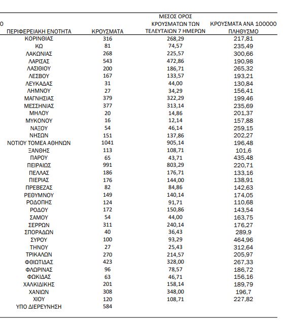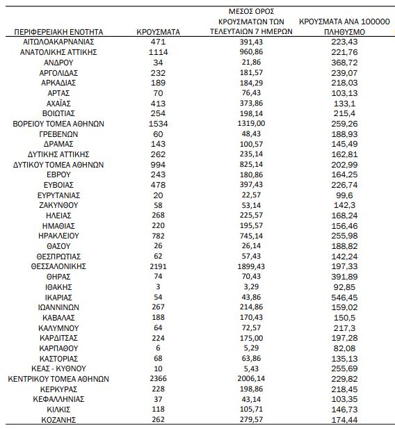 Ο συνολικός αριθμός των κρουσμάτων ανέρχεται σε 3.009.333 (ημερήσια μεταβολή +0.8%), εκ των οποίων 49.2% άνδρες. Με βάση τα επιβεβαιωμένα κρούσματα των τελευταίων 7 ημερών, 189 θεωρούνται σχετιζόμενα με ταξίδι από το εξωτερικό και 1.330 είναι σχετιζόμενα με ήδη γνωστό κρούσμα. To Rt για την επικράτεια βάσει των κρουσμάτων εκτιμάται σε 0.99 (95% ΔΕ: 0.92 – 1.11).