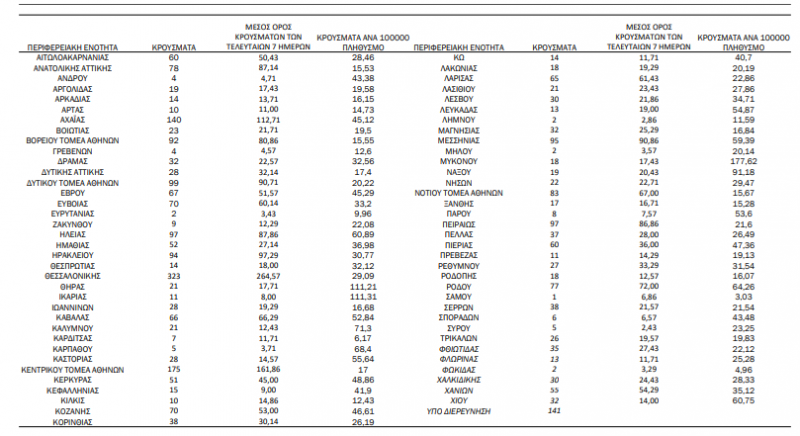 Με βάση τα επιβεβαιωμένα κρούσματα των τελευταίων 7 ημερών, 217 θεωρούνται σχετιζόμενα με ταξίδι από το εξωτερικό και 1.794 είναι σχετιζόμενα με ήδη γνωστό κρούσμα.