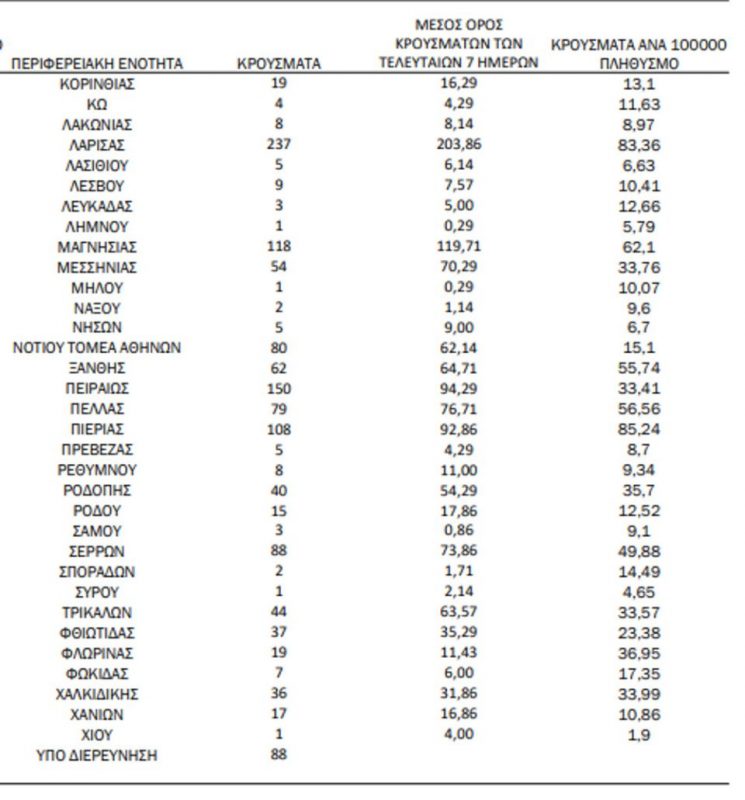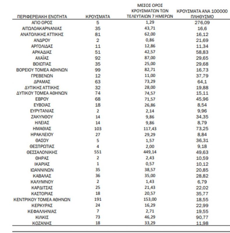Οι νέοι θάνατοι ασθενών με COVID-19 είναι 43, ενώ από την έναρξη της επιδημίας έχουν καταγραφεί συνολικά 15.598 θάνατοι. Το 95.3% είχε υποκείμενο νόσημα ή/και ηλικία 70 ετών και άνω.