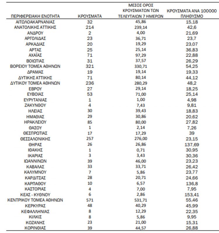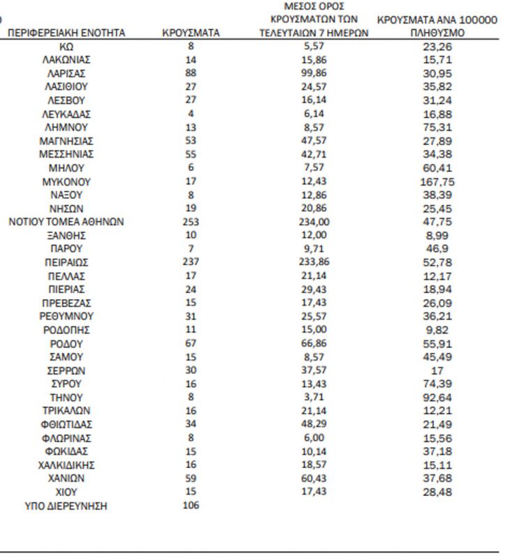 Τα νέα εργαστηριακά επιβεβαιωμένα κρούσματα της νόσου(άτομα) που καταγράφηκαν τις τελευταίες 24 ώρες ήταν 3.424. Ο συνολικός αριθμός των ατόμων που νόσησαν ανέρχεται σε 3.417.613 (ημερήσια μεταβολή +0.1%), εκ των οποίων 48.8% άνδρες.