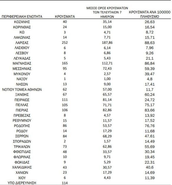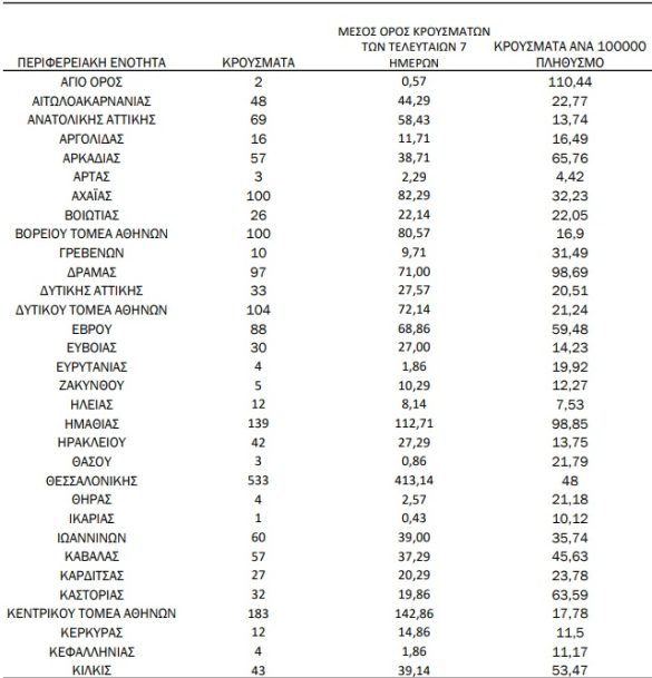 Με βάση τα επιβεβαιωμένα κρούσματα των τελευταίων 7 ημερών, 153 θεωρούνται σχετιζόμενα με ταξίδι από το εξωτερικό και 3.107 είναι σχετιζόμενα με ήδη γνωστό κρούσμα.