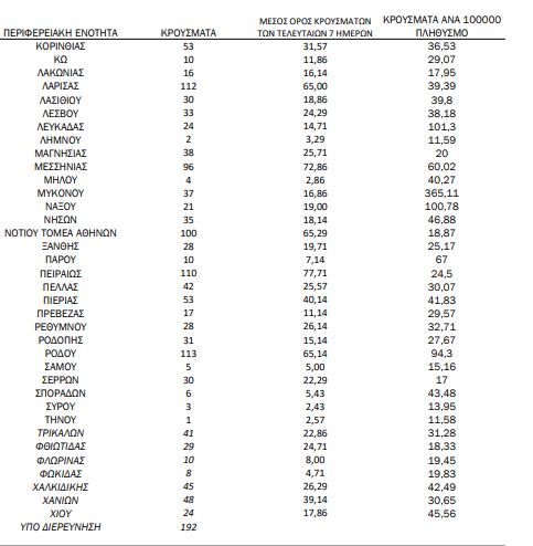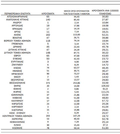 Με βάση τα επιβεβαιωμένα κρούσματα των τελευταίων 7 ημερών, 206 θεωρούνται σχετιζόμενα με ταξίδι από το εξωτερικό και 1.404 είναι σχετιζόμενα με ήδη γνωστό κρούσμα.