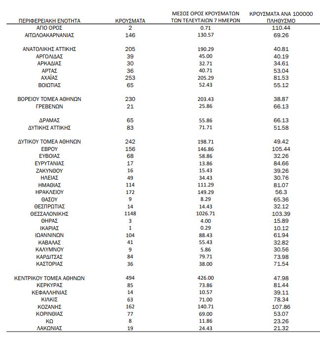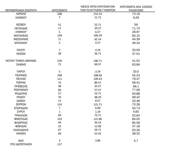 Με βάση τα επιβεβαιωμένα κρούσματα των τελευταίων 7 ημερών, 96 θεωρούνται σχετιζόμενα με ταξίδι από το εξωτερικό και 2.412 είναι σχετιζόμενα με ήδη γνωστό κρούσμα.