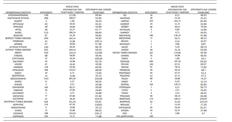 Ο συνολικός αριθμός των κρουσμάτων ανέρχεται σε 938.903 (ημερήσια μεταβολή +0.8%), εκ των οποίων 50.6% άνδρες. Με βάση τα επιβεβαιωμένα κρούσματα των τελευταίων 7 ημερών, 105 θεωρούνται σχετιζόμενα με ταξίδι από το εξωτερικό και 2.712 είναι σχετιζόμενα με ήδη γνωστό κρούσμα.