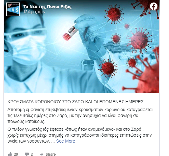 Συγκεκριμένα όπως αναφέρεται επίσης: «Ο πλέον γνωστός ιός έφτασε -όπως ήταν αναμενόμενο- και στο Ζαρό , χωρίς ευτυχές μέχρι στιγμής να καταγράφονται ιδιαίτερες επιπτώσεις στην υγεία των νοσούντων.