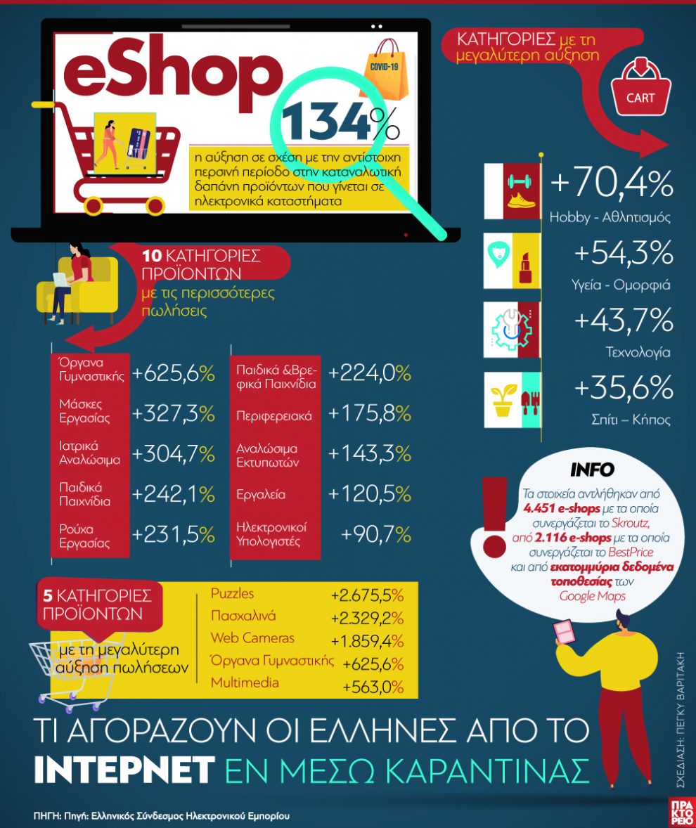 Σύμφωνα με την έρευνα, τον Μάρτιο εκατοντάδες κατηγορίες έχουν εκτοξευθεί από τις online αγορές, όπως puzzles με +1.654%, web cameras με +1.256% και στρώματα γυμναστικής με +772%, σε σχέση με τον Φεβρουάριο εφέτος.
