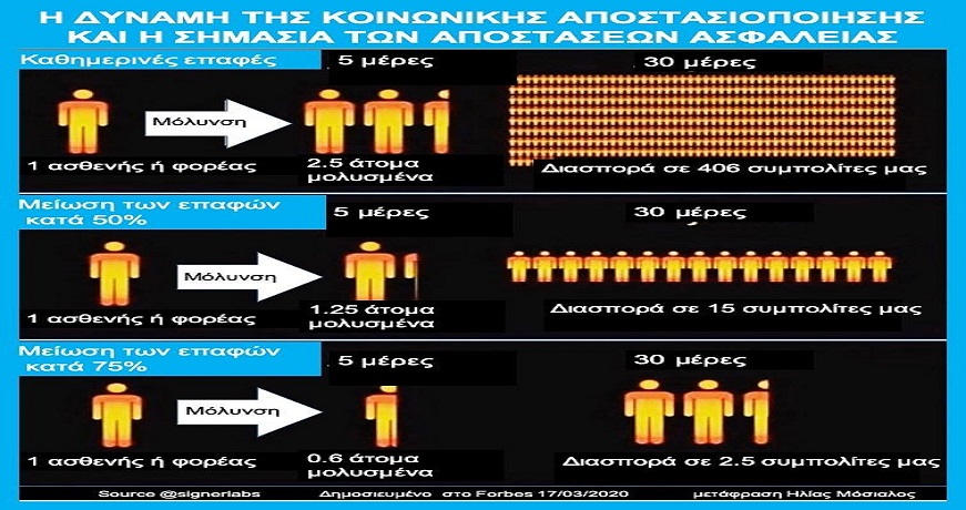 Η πρώτη στήλη δείχνει έναν ασθενή ή φορέα που μπορεί να μολύνει σε 5 ημέρες 2,5 άτομα. Σε 30 ημέρες η διασπορά μπορεί να φτάσει τους 406. Στη δεύτερη φαίνεται τι συμβαίνει με τη μείωση των επαφών κατά 50%: η μόλυνση μπορεί να φτάσει σε 1,5 άτομο και σε 30 ημέρες να νοσήσουν μόλις 15.Στην τρίτη στήλη, με μείωση των επαφών κατά 75%, φαίνεται ότι μπορεί να μολυνθούν μόλις 0,6 άτομα και η διασπορά σε ένα μήνα να είναι μόνο σε 2.5.