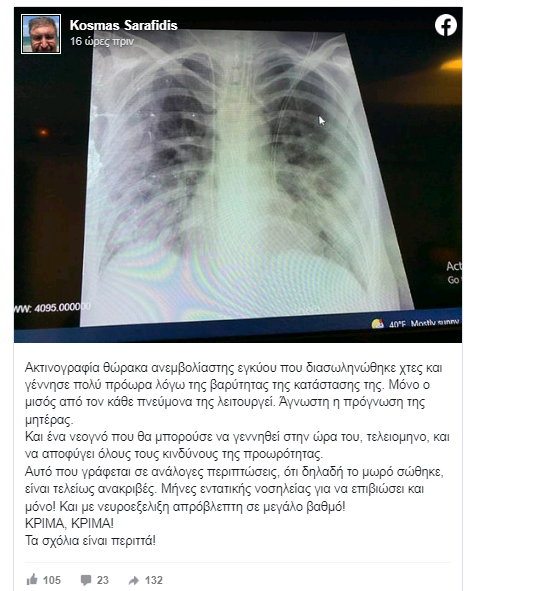 Σοκαριστική είναι η ακτινογραφία πνεύμονα της 41 ετών εγκύου που δημοσιοποίησε στο Facebook ο Καθηγητης Παιδιατρικής του ΑΠΘ, Κοσμάς Σαραφίδης.