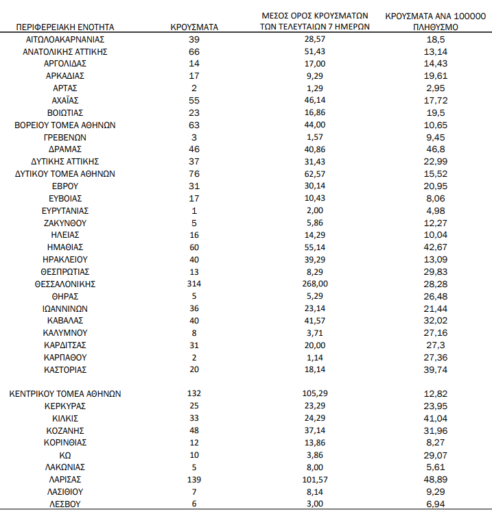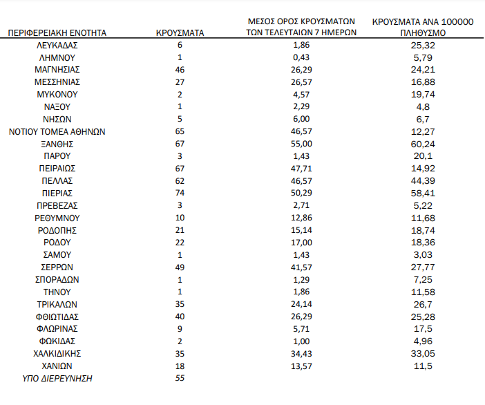 Ο συνολικός αριθμός των κρουσμάτων ανέρχεται σε 655.767 (ημερήσια μεταβολή +0.3%), εκ των οποίων 50.9% άνδρες. Με βάση τα επιβεβαιωμένα κρούσματα των τελευταίων 7 ημερών, 71θεωρούνται σχετιζόμενα με ταξίδι από το εξωτερικό και 3.205 είναι σχετιζόμενα με ήδη γνωστό κρούσμα.