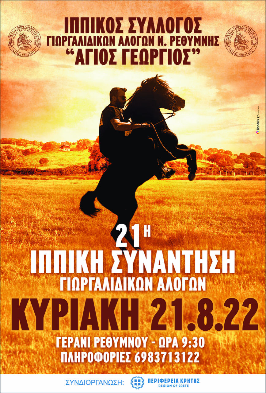 O ιππικός σύλλογος Γιωργαλίδικων αλόγων νομού Ρεθύμνης «Άγιος Γεώργιος» και η Περιφέρεια Κρήτης συνδιοργανώνουν την 21η ιππική συνάντηση Γιωργαλίδικων αλόγων. Η εκδήλωση θα πραγματοποιηθεί στις 21 Αυγούστου στο ιπποδρόμιο που βρίσκεται στο Γεράνι, Ρεθύμνου. Η ώρα έναρξης έχει οριστεί στις 9:30 και η είσοδος για τους θεατές θα είναι ελεύθερη