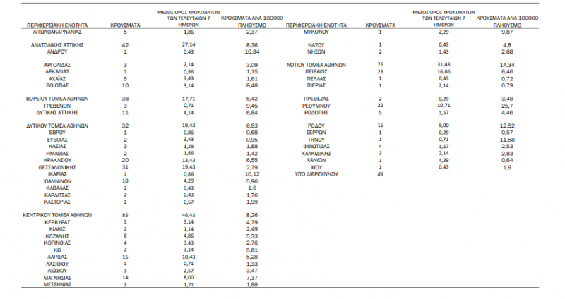 Στον πίνακα που ακολουθεί δείτε πώς διαμορφώθηκε η γεωγραφική κατανομή των νέων μολύνσεων ανά την επικράτεια: