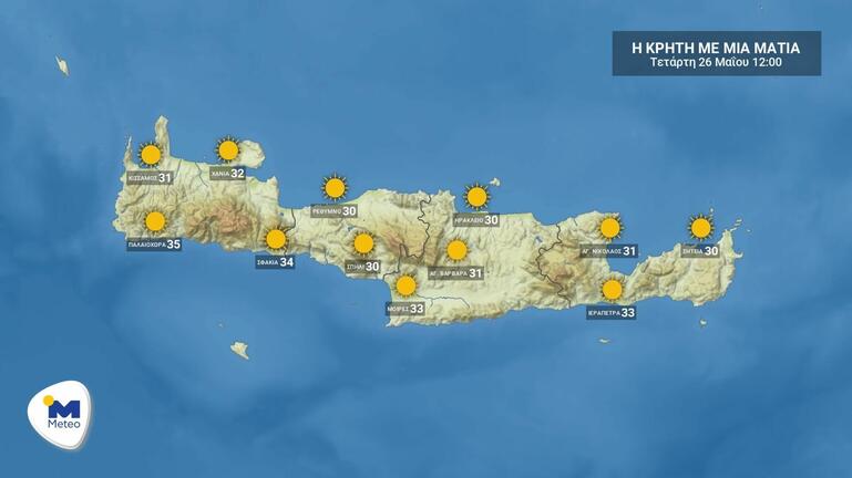 Γενικά αίθριο καιρό στην Κρήτη αναμένουν την Τετάρτη οι μετεωρολόγοι. Σύμφωνα με την πρόγνωση του meteo.gr η ηλιοφάνεια με αραιές νεφώσεις κατά διαστήματα θα είναι τα κύρια χαρακτηριστικά του καιρού. Οι άνεμοι θα πνέουν βορειοδυτικοί μέτριοι εντάσεως έως και 5 μποφόρ ενώ η θερμοκρασία θα κυμανθεί από 20 έως 30 βαθμούς Κελσίου.