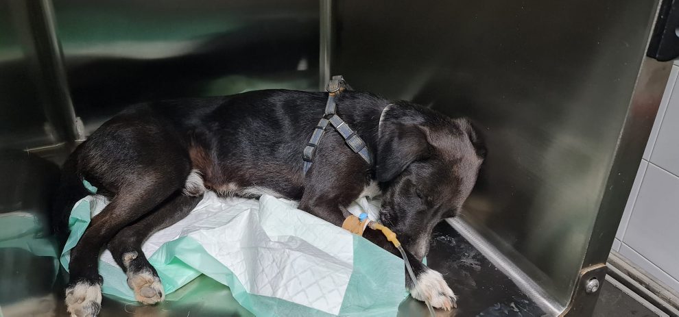 Το άμοιρο σκυλί οδηγήθηκε στο κτηνιατρείο του Ανδρέα Μπαντουβά από άγνωστους που το βρήκαν και υπέθεσαν ότι είχε πάθει δηλητηρίαση και ο επιστήμονας από το Ηράκλειο προσέφερε τις πρώτες βοήθειες στο τετράποδο και το απάλλαξε από τους πόνους: