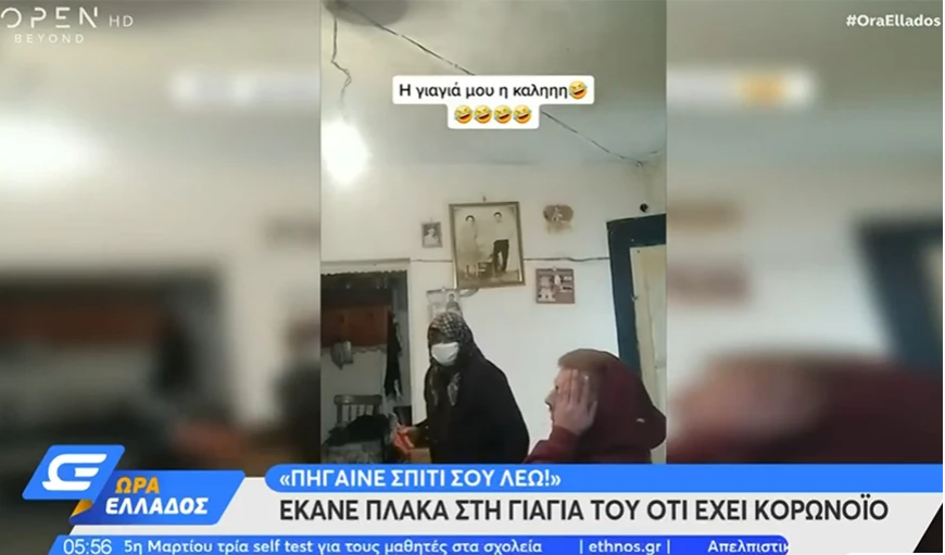 Viral έχει γίνει ένα βίντεο με πρωταγωνίστρια μια γιαγιά από την Κρήτη που αντιδρά όταν ο εγγονός της τής κάνει πλάκα ότι έχει κορονοϊό. Ο νεαρός που βιντεοσκοπεί το περιστατικό, πηγαίνει στο σπίτι της γιαγιάς του χωρίς να φοράει μάσκα και της λέει ότι έχει πυρετό.