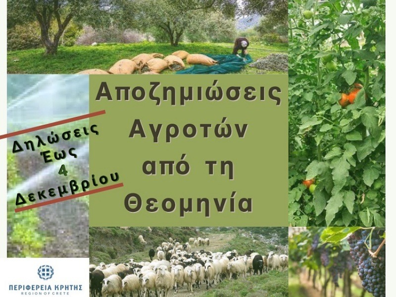 Η Περιφέρεια Κρήτης ανακοινώνει πως οι κατά κύριο επάγγελμα αγρότες που επλήγησαν από την πρόσφατη Θεομηνία στην Κρήτη, αλλά δεν καλύπτονται οι ζημιές τους για αποζημιώσεις από τον ΕΛΓΑ στην κατηγορία Κρατικών Οικονομικών Ενισχύσεων (πρ. ΠΣΕΑ,) θα πρέπει να απευθύνονται στους ανταποκριτές του ΕΛΓΑ στους Δήμους τους για να ακολουθήσουν τη σχετική διαδικασία δήλωσης που θα γίνεται μέχρι και 4 Δεκεμβρίου 2020.