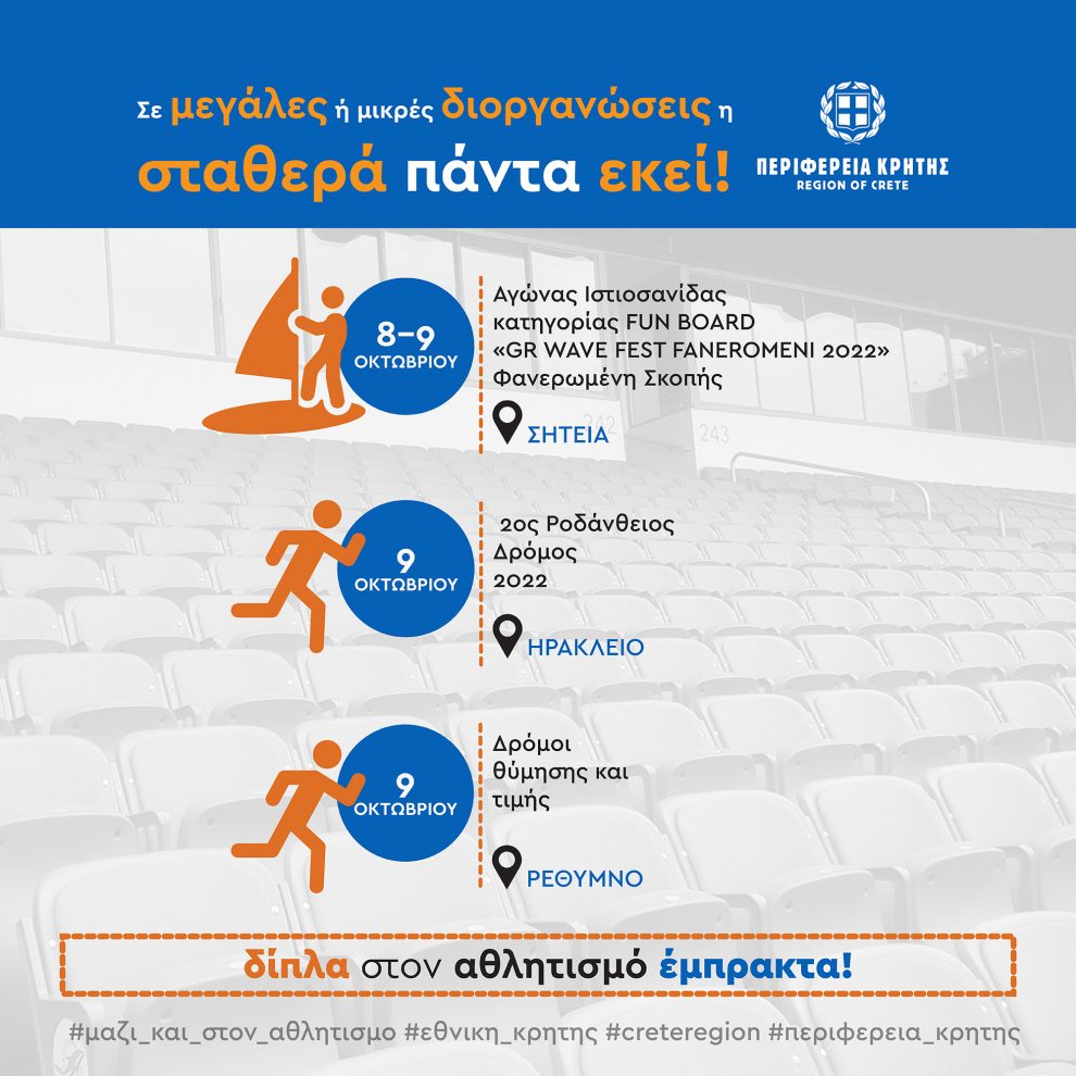 Σημαντικές διοργανώσεις πραγματοποιούνται τις προσεχείς ημέρες στην Κρήτη, με την στήριξη της Περιφέρειας Κρήτης.Στις 8 και 9 Οκτωβρίου στην θαλάσσια περιοχή της Φανερωμένης Σκοπής Σητείας θα πραγματοποιηθεί ο αγώνας Ιστιοσανίδας κατηγορίας FUN BOARD , με ονομασία «GR WAVE FEST FANEROMENI 2022» .