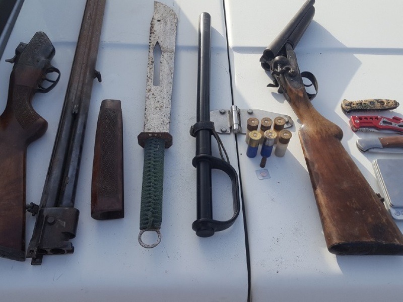 Κατά τη διάρκεια της έρευνας βρέθηκαν και κατασχέθηκαν, 2 κυνηγετικά όπλα, 2 χειροβομβίδες, φυσίγγια, σπαθί, 3 μαχαίρια, ράβδος και ζυγαριά ακριβείας