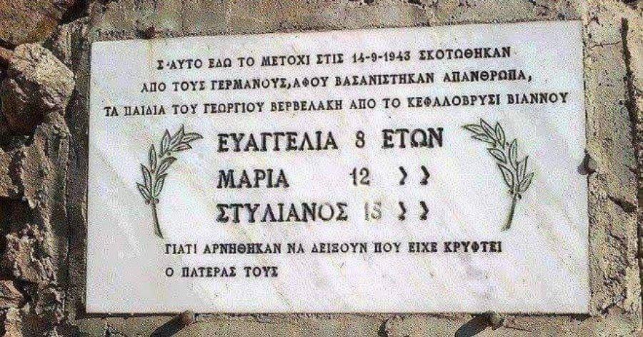 “Σ’ αυτό εδώ το μετόχι στις 14-9-1943 σκοτώθηκαν από τους Γερμανούς, αφού βασαviσθηκαν απάνθρωπα, τα παιδιά του Γεώργιου Βερβελάκη από το Κεφαλοβρύσι Βιάννου, Ευαγγελία 8 ετών, Μαρία 12 ετών, Στυλιανός 15 ετών Γιατί αρνήθηκαν να δείξουν που είχε κρυφτεί ο πατέρας τους”