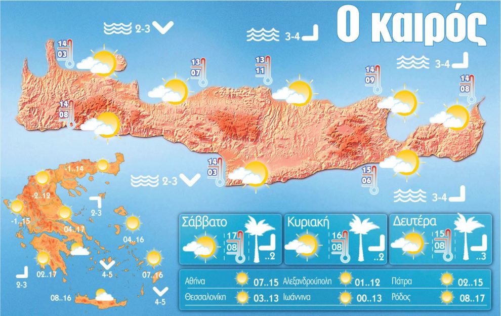 Πιο αναλυτικά, σχεδόν αίθριος, προβλέπεται ο καιρός στην Κρήτη σήμερα Παρασκευή, 11 Φεβρουαρίου, με λίγες μόνο τοπικές νεφώσεις τις πρωινές ώρες, σύμφωνα με τις προγνώσεις. Οι άνεμοι θα πνέουν βόρειοι 4 με 5 Μποφόρ με γρήγορη εξασθένηση. Το βράδυ θα στραφούν σε νοτιοδυτικούς 3 με 4 Μποφόρ. Η θερμοκρασία θα κυμανθεί από 08 έως 16 βαθμούς Κελσίου.