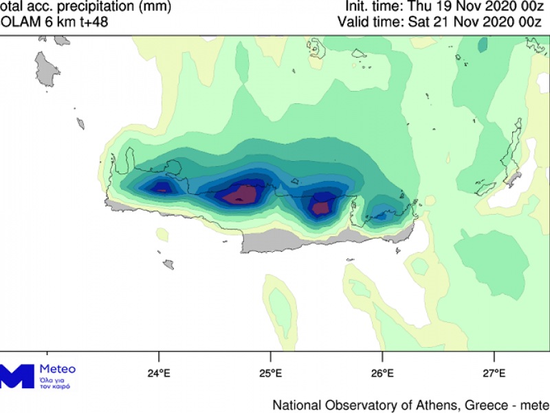Σύμφωνα με τα τελευταία προγνωστικά δεδομένα του Εθνικού Αστεροσκοπείου Αθηνών / meteo.gr, ισχυρές βροχές και καταιγίδες αναμένονται από την Πέμπτη 19/11 στην Κρήτη, με μεγάλα ύψη βροχής τα οποία πιθανότατα θα δημιουργήσουν προβλήματα.