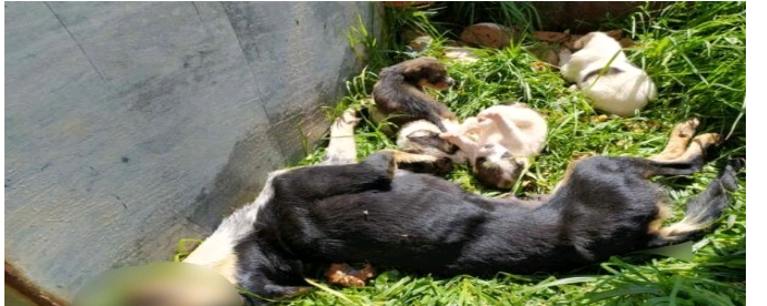 Όπως φαίνεται στις φωτογραφίες, μια σκυλίτσα εντοπίστηκε νεκρή, αφού είχε δηλητηριαστεί από φόλα, με τα εφτά κουτάβια της να προσπαθούν να θηλάσουν.
