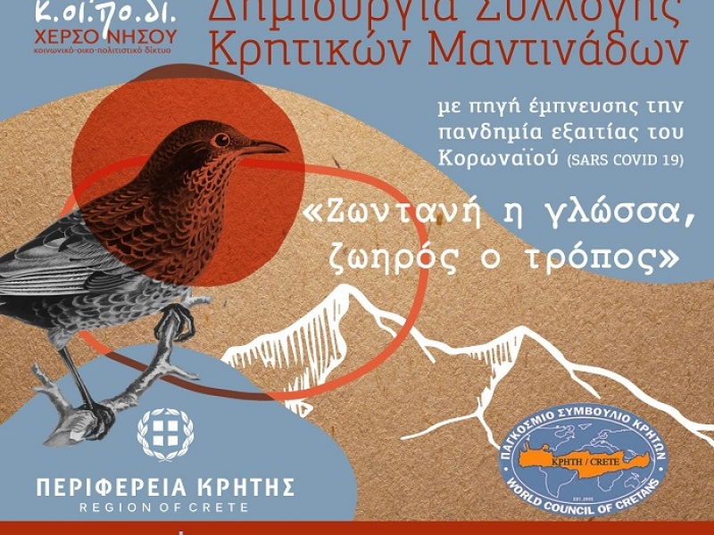 Το ΚΟΙΠΟΔΙ ευχαριστεί ιδιαιτέρως: τον Περιφερειάρχη Κρήτης Σταύρο Αρναουτάκη, τον Εντεταλμένο Σύμβουλο Πολιτισμού & Απόδημου Ελληνισμού Περιφέρειας Κρήτης Κωνσταντίνο Φασουλάκη και τον Πρόεδρο του Παγκοσμίου Συμβουλίου Κρητών για την αιγίδα που παρέχουν στην πρωτοβουλία δημιουργίας της Συλλογής Κρητικών Μαντινάδων με έμπνευση από την πανδημία και καλεί τους δημιουργούς από όλον τον κόσμο να συμμετέχουν!