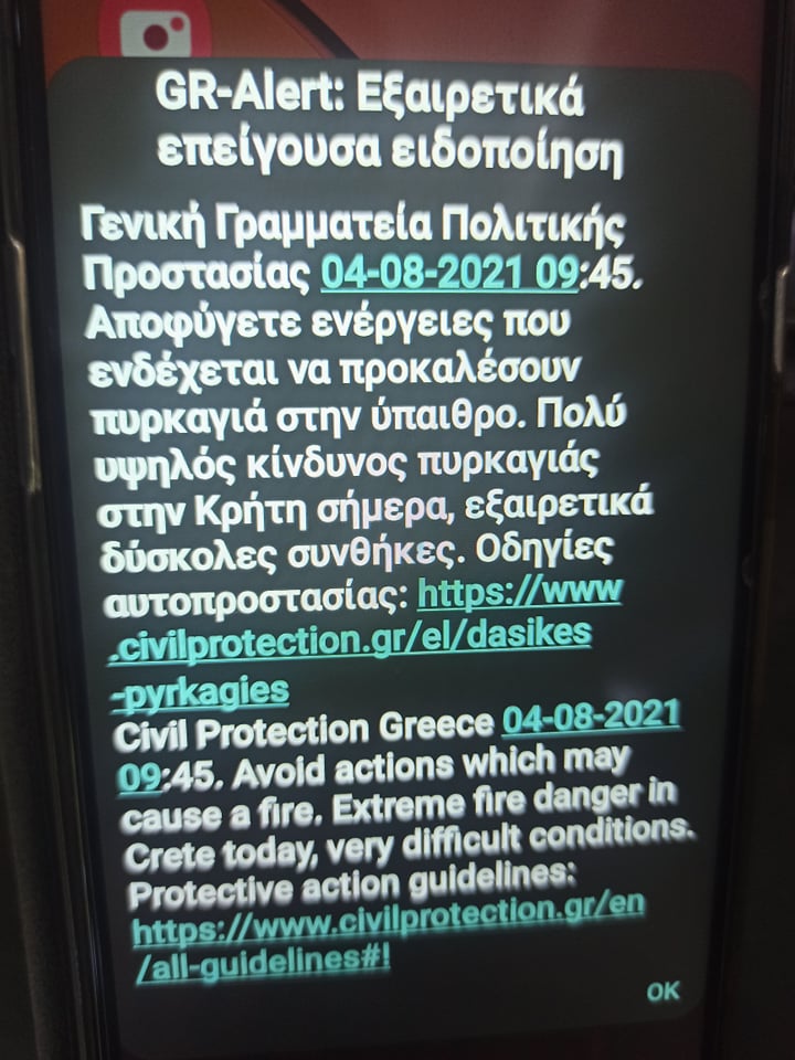 Το μήνυμα αναφέρει: “Αποφύγετε ενέργειες που ενδέχεται να προκαλέσουν πυρκαγιά στην ύπαιθρο. Πολύ υψηλός κίνδυνος πυρκαγιάς στην Κρήτη σήμερα, εξαιρετικά δύσκολες συνθήκες”