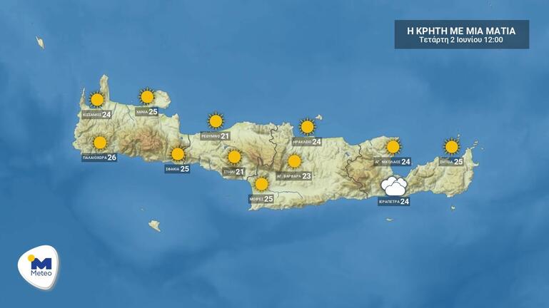 Νεφώσεις κατά τόπους και τοπικές βροχές αναμένονται την Τετάρτη 2 Ιουνίου στην Κρήτη και σε άλλες περιοχές της χώρας, χωρίς αξιόλογη μεταβολή θα είναι η θερμοκρασία.