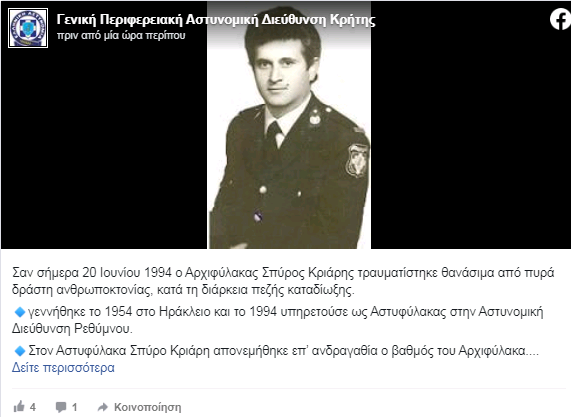 27 χρόνια συμπληρώνονται σήμερα από τον θάνατο του Αρχιφύλακα της ΕΛ.ΑΣ Σπύρου Κριάρη.