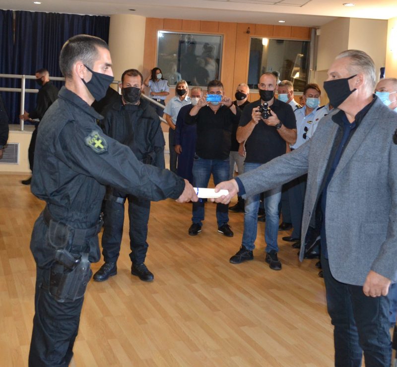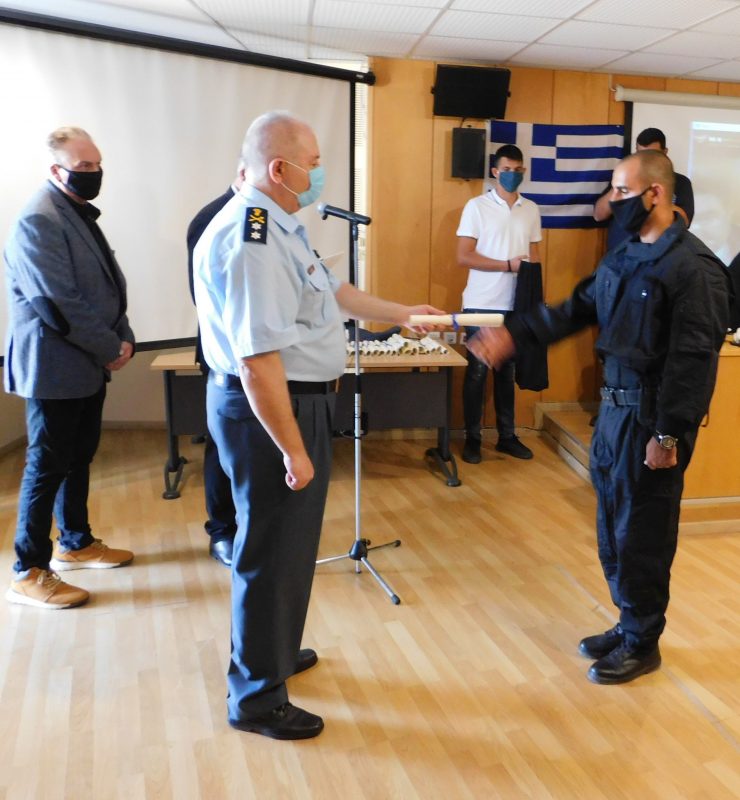 Τα πιστοποιητικά σπουδών επέδωσαν ο Γενικός Περιφερειακός Αστυνομικός Διευθυντής Κρήτης, Υποστράτηγος Αντώνιος Ρουτζάκης και ο Διευθυντής της Διεύθυνσης Ειδικών Αστυνομικών Δυνάμεων, Υποστράτηγος Γεώργιος Παππάς.