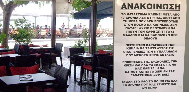 Όπως ο ίδιος καταγγέλλει, το μαγαζί του κλείνει μετά από 17 χρόνια επιχειρηματικής δραστηριότητας εξαιτίας του μειωμένου τζίρου που έχει προκύψει από την εφαρμογή του αντικαπνιστικού νόμου.
