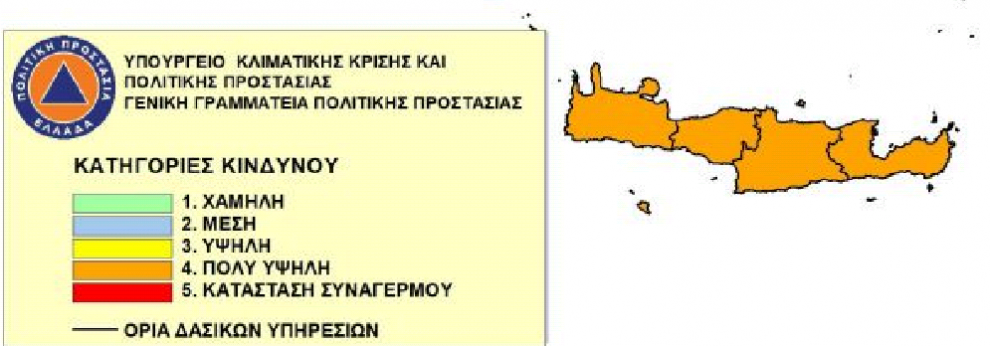 Η Πολιτική Προστασία Περιφέρειας Κρήτης ενημερώνει ότι, σύμφωνα με τον ημερήσιο Χάρτη Πρόβλεψης Κινδύνου Πυρκαγιάς της Γενικής Γραμματείας Πολιτικής Προστασίας για αύριο Σάββατο 13 Ιουλίου 2024 η κατηγορία Κινδύνου Πυρκαγιάς για όλη την Κρήτη, είναι κατηγορίας κινδύνου 4 (πολύ υψηλός).