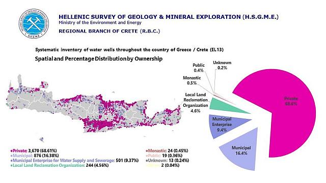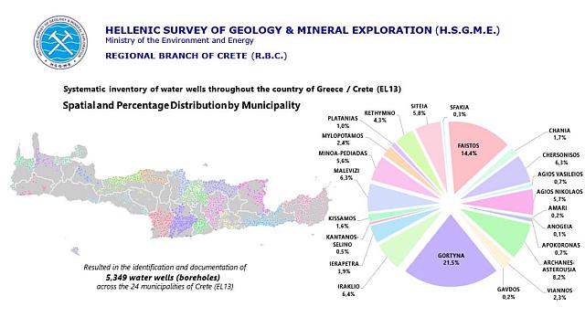 Το σοβαρό πρόβλημα της λειψυδρίας, η έλλειψη υποδομών και δικτύων για τις ανάγκες αγροτών και ΤΟΕΒ σε άρδευση αλλά και για την ύδρευση στους Δήμους, έχει καταστήσει την Κρήτη κυριολεκτικά «σουρωτήρι» καθώς το παράρτημα της Ελληνικής Αρχής Γεωλογικών και Μεταλλευτικών Ερευνών (πρώην ΙΓΜΕ) και ο προιστάμενός του Γιάννης Μιχαλάκης κατέγραψαν μία προς μία μέσα από μια μελέτη τον απίστευτο αριθμό των 5.349!! γεωτρήσεων.