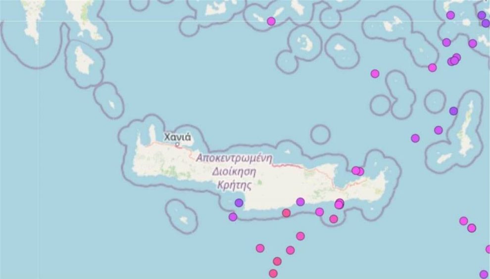 Παρατηρώντας τον χάρτη της Κρήτης, καταγράφονται κεραυνοί στα νότια και ανατολικά του νησιού και μάλιστα με μεγάλη ένταση και πυκνότητα.