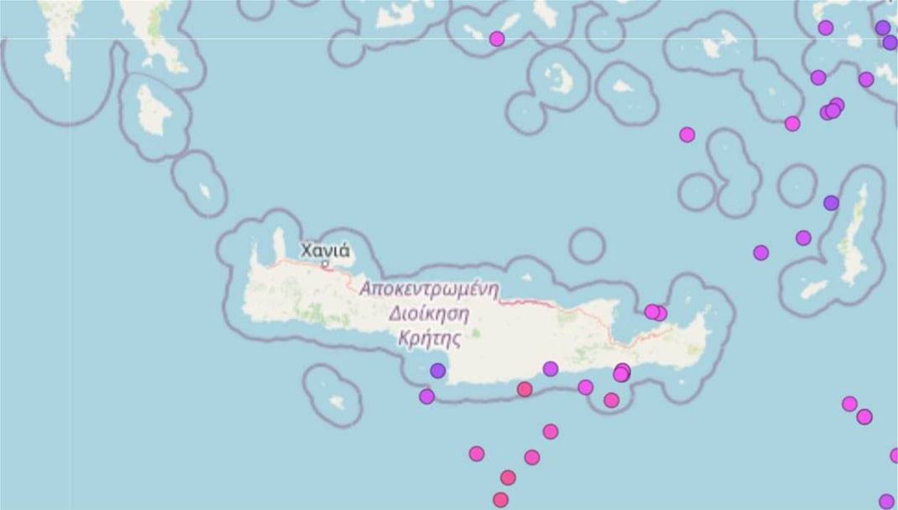 Παρατηρώντας τον χάρτη της Κρήτης, καταγράφονται κεραυνοί στα νότια και ανατολικά του νησιού και μάλιστα με μεγάλη ένταση και πυκνότητα.
