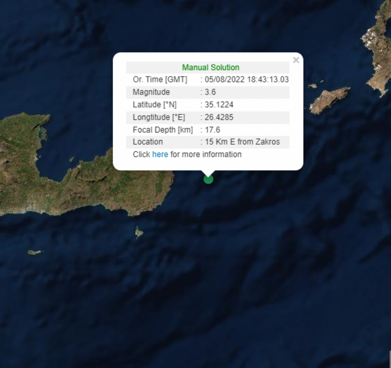 Σεισμική δόνηση μεγέθους 3,6 βαθμών της Κλίμακας Ρίχτερ σημειώθηκε στις 21:43 το βράδυ της Παρασκευής ανατολικά της Κρήτης.