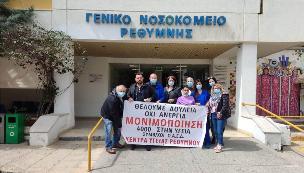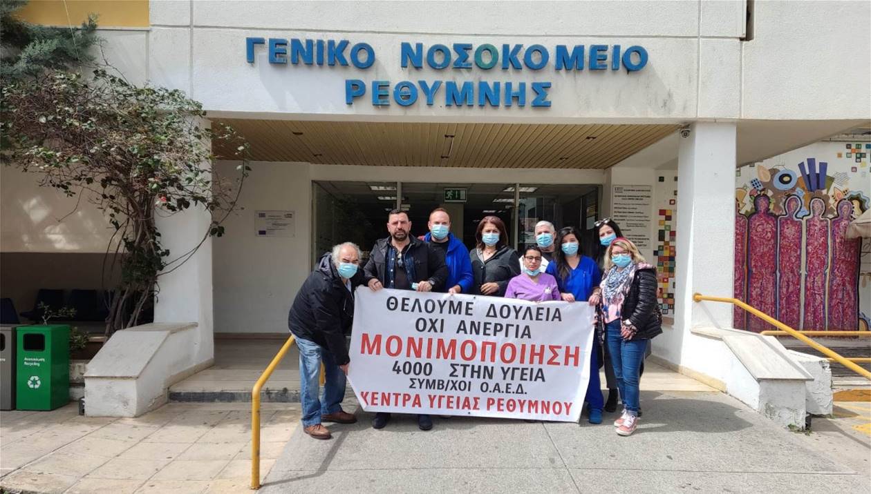 Για το θέμα η Επιτροπή Αγώνα ειδικού προγράμματος 4000 στην Υγεία μέσω ΟΑΕΔ εξέδωσε ανακοίνωση σύμφωνα με την οποία «η Κρήτη, το Ρέθυμνο και οι συμβασιούχοι ΟΑΕΔ στις τοπικές δομές Υγείας του νομού, πρωτοπόροι στον αγώνα και στη στάση εργασίας εγκεκριμένη από την ΠΟΕΔΗΝ, διαμαρτυρήθηκαν και βροντοφώναξαν (σε συμπαράσταση των συναδέλφων στην Αθήνα όπου η ηγεσία του υπουργείου Εργασίας ούτε που καταδέχτηκε να συζητήσει) “φτάνει πια στην κοροϊδία και στην εκμετάλλευση των επτά και πλέον χρόνων προσφοράς στο Εθνικό Σύστημα Υγείας με εξευτελιστικές αποδοχές ανειδίκευτου εργάτη, ίδιες από το 2016, χωρίς στοιχειώδη επιδόματα (τέκνων), χωρίς τριετίες, με πλαφόν νυχτερινών και αργιών ΑΛΛΑ με υποχρεώσεις και καθηκοντολόγιο μονίμων υπαλλήλων με ό,τι αυτό συνεπάγεται”.