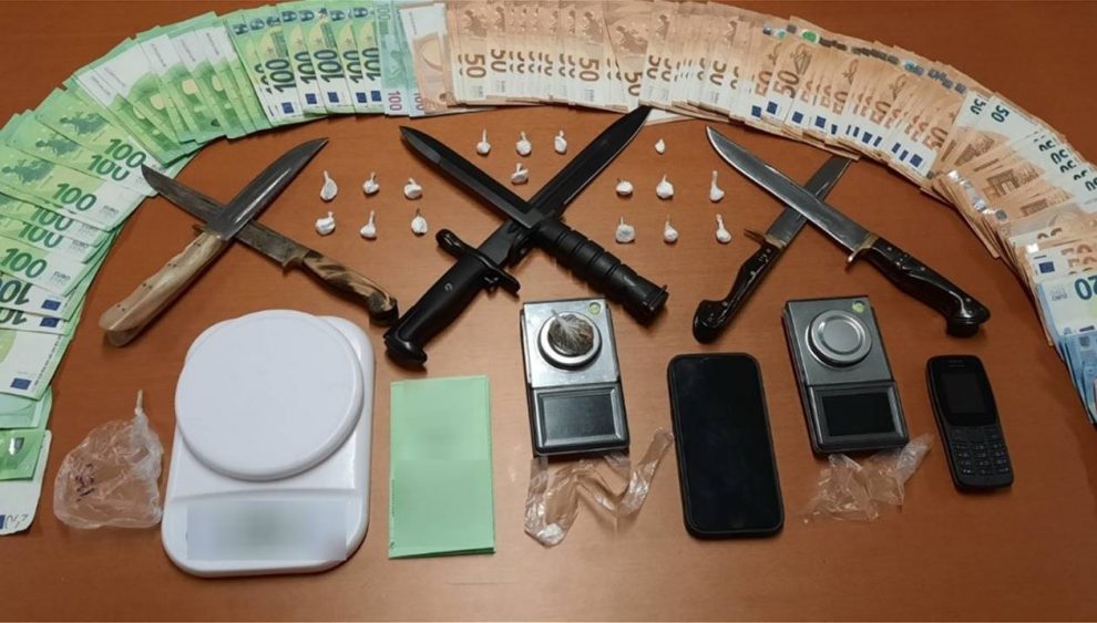 Μετά τις συλλήψεις, ακολούθησε «σαρωτικός» έλεγχος στον 33χρονο, αλλά και στο σπίτι του. Εκεί, εντοπίστηκαν -και κατασχέθηκαν- 16 «φιξάκια» με κοκαΐνη, μικροποσότητα κάνναβης, το ποσό των 9.790 ευρώ που φέρεται να προέκυψε από τη διακίνηση ναρκωτικών, 3 ζυγαριές ακριβείας, δύο ξιφολόγχες πολεμικού τυφεκίου, τέσσερα μαχαίρια και δύο κινητά τηλέφωνα.