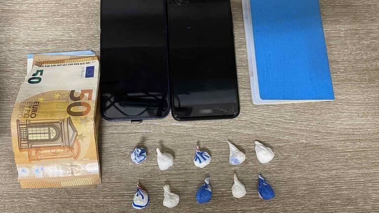 Κατά την διάρκεια του ελέγχου βρέθηκαν στην κατοχή του και κατασχέθηκαν δέκα (10) αυτοσχέδιες συσκευασίες περιέχουσες συνολικά 6,7 γραμμάρια κοκαΐνης, το χρηματικό ποσό των 170 ευρώ ως προερχόμενα από παράνομες δραστηριότητες και δύο (2) κινητά τηλέφωνα.