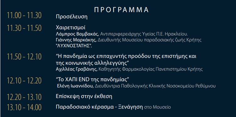 Στα εγκαίνια που θα γίνουν στο Λιμ. Χερσονήσου την Κυριακή 27 Ιουνίου στις 11.30 θα μιλήσει ο καθηγητής Φαρμακολογίας Πανεπιστημίου Κρήτης Αχιλλέας Γραβάνης με θέμα «Η πανδημία ως επιταχυντής προόδου της επιστήμης και της κοινωνικής αλληλεγγύης», ενώ χαιρετισμό θ’ απευθύνει ο Αντιπεριφερειάρχης Δημόσιας Υγείας & Κοινωνικής Πολιτικής Λάμπρος Βαμβακάς. Στο πλαίσιο της έκθεσης θα προβληθούν το video “XAΠΙ END” αλλά και η πρόσφατα βραβευμένη ταινία μικρού μήκους «ΠΕΤΑΛΟΥΔΕΣ ΣΤΟΝ ΟΥΡΑΝΟ: οι κρητικές μαντινάδες» (διάρκεια 14’) του Γιάννη Μαρκάκη, μια παραγωγή του Μουσείου με συγχρηματοδότηση της Περιφέρειας Κρήτης.
