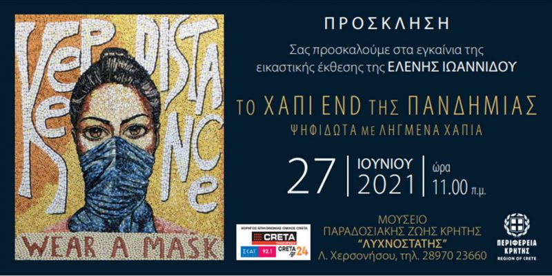 Το Μουσείο παραδοσιακής ζωής Κρήτης «ΛΥΧΝΟΣΤΑΤΗΣ» συνεχίζοντας τις εκδηλώσεις για τον εορτασμό της Διεθνούς Ημέρας Μουσείων 2021 με τίτλο «Το μέλλον των μουσείων: αναστοχασμός και επανεκκίνηση», εγκαινιάζει την Κυριακή 27 Ιουνίου την εικαστική έκθεση «To ΧΑΠΙ END της πανδημίας : ψηφιδωτά με ληγμένα χάπια» με έργα της γιατρού λοιμωξιολόγου στο Νοσοκομείο Ρεθύμνου Ελένης Ιωαννίδου. Η Ε. Ιωαννίδου, χρησιμοποιεί ληγμένα χάπια από το Κοινωνικό Ιατρείο Ρεθύμνου -όπου και εργάζεται εθελοντικά- ως ψηφίδες, για τη δημιουργία με την τεχνική του μωσαϊκού ιδιότυπων έργων με θέματα εμπνευσμένα από την πανδημία.