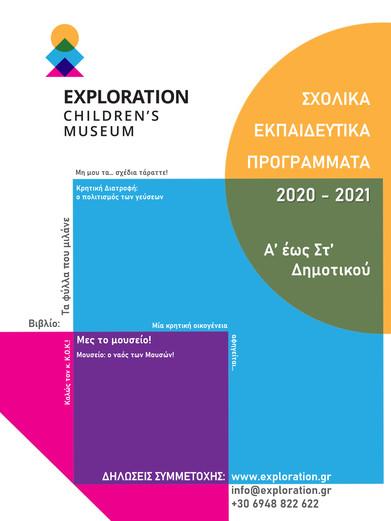 Για περισσότερες πληροφορίες επισκεφτείτε την επίσημη ιστοσελίδα του Μουσείου: www.exploration.gr. Παρακαλούμε επικοινωνήστε με το Τμήμα Εκπαίδευσης του Μουσείου στο mail info@exploration.gr ή στο τηλέφωνο +30 6948 822 622 για να οργανώσουμε από κοινού μία ασφαλή και ευχάριστη μουσειακή εμπειρία στο σχολείο σας.