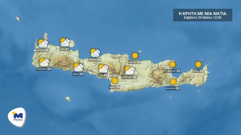 Hλιοφάνεια με λίγες νεφώσεις, αυξημένες τις θερμές ώρες, θα επικρατήσουν το Σάββατο 29 Μαίου στην Κρήτη.