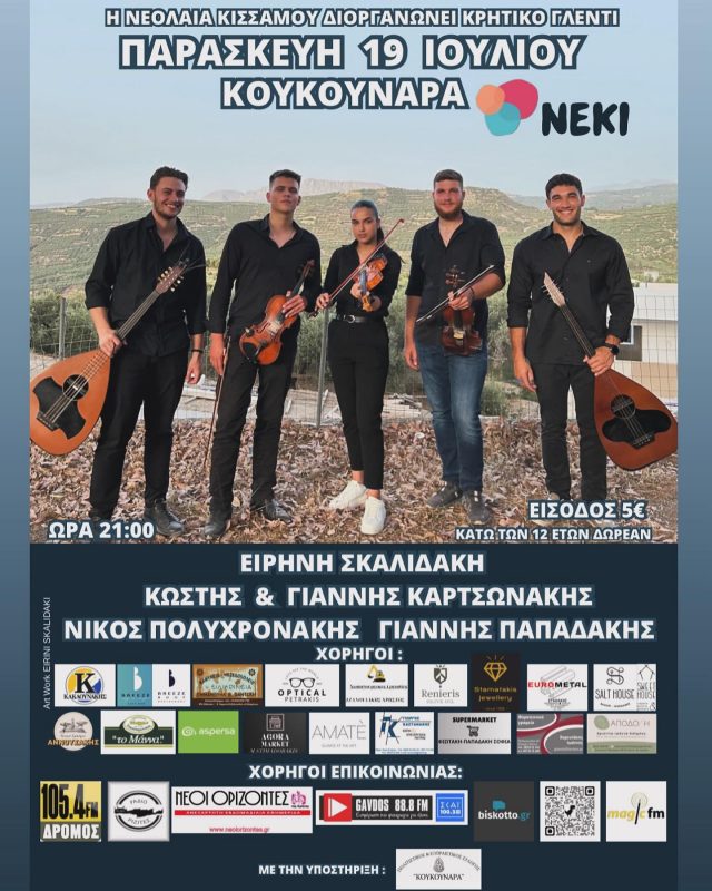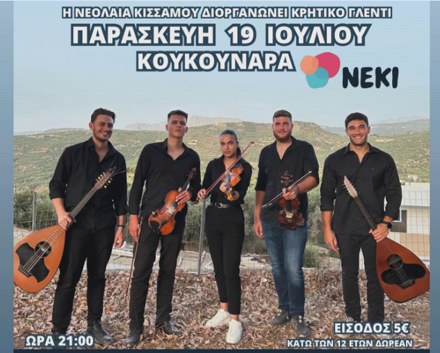 Η Νεολαία Κισάμου σας προσκαλεί την Παρασκευή 19 Ιουλίου (9 μ.μ.) στην Κρητική Εκδήλωση που θα πραγματοποιηθεί στον προαύλιο χώρου του σχολείου Κουκουναράς. Θα μας διασκεδάσουν: Κωστής και Γιάννης Καρτσωνάκης, Νίκος Πολυχρονάκης, Γιάννης Παπαδάκης, Ειρήνη Σκαλιδάκη.