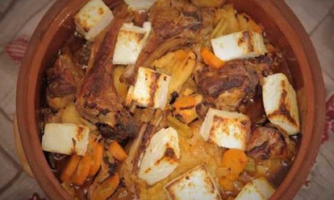 Τσιγαρίζουμε το κρέας στο ελαιόλαδο. Προσθέτουμε το σκόρδο και το κρεμμύδι.Στην συνέχεια προσθέτουμε τον πελτέ και αφού τον τσιγαρίσουμε 2 λεπτάκια, βάζουμε τα καρότα,την σεληνόριζα και το σέλερι.Αφού μαραθούν λίγο,σβήνουμε με το μαρουβά. Βάζουμε τα μυρωδικά .Προσθέτουμε λίγο νερό ίσα να μισοσκεπάζει τα υλικά. Χαμηλώνουμε τη φωτιά, σκεπάζουμε και σιγομαγειρεύουμε για μία ώρα περίπου. Μεταφέρουμε σε μία γάστρα και κόβουμε μέσα μικρά καρεδάκια από τυροζούλι. Ψήνουμε άλλα 30 λεπτά.