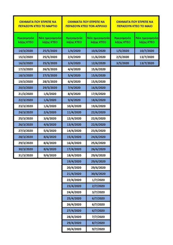 Όσα οχήματα έχουν Δελτίο Τεχνικού Ελέγχου με αναγραφόμενη ημερομηνία λήξης από 14-3-2020 έως και 3-5-2020 δίνεται παράταση έως και 70 ημέρες από την αναγραφόμενη ημερομηνία λήξης του Δελτίου Τεχνικού Ελέγχου.